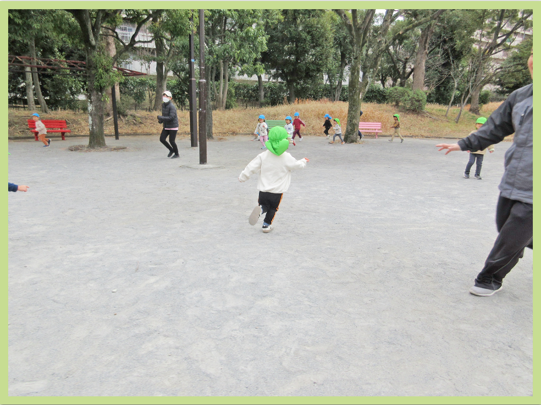 お兄さんお姉さんと手を繋ぐ際は、少し緊張しながらもしっかりと手を繋ぐ事が出来ました。公園では、外が寒かった事もあり保育者が鬼になり、こどもたちを捕まえる鬼ごっこをして体を温めました。こどもたちは、保育者に捕まらないように必死に逃げていてとても可愛らしかったです。