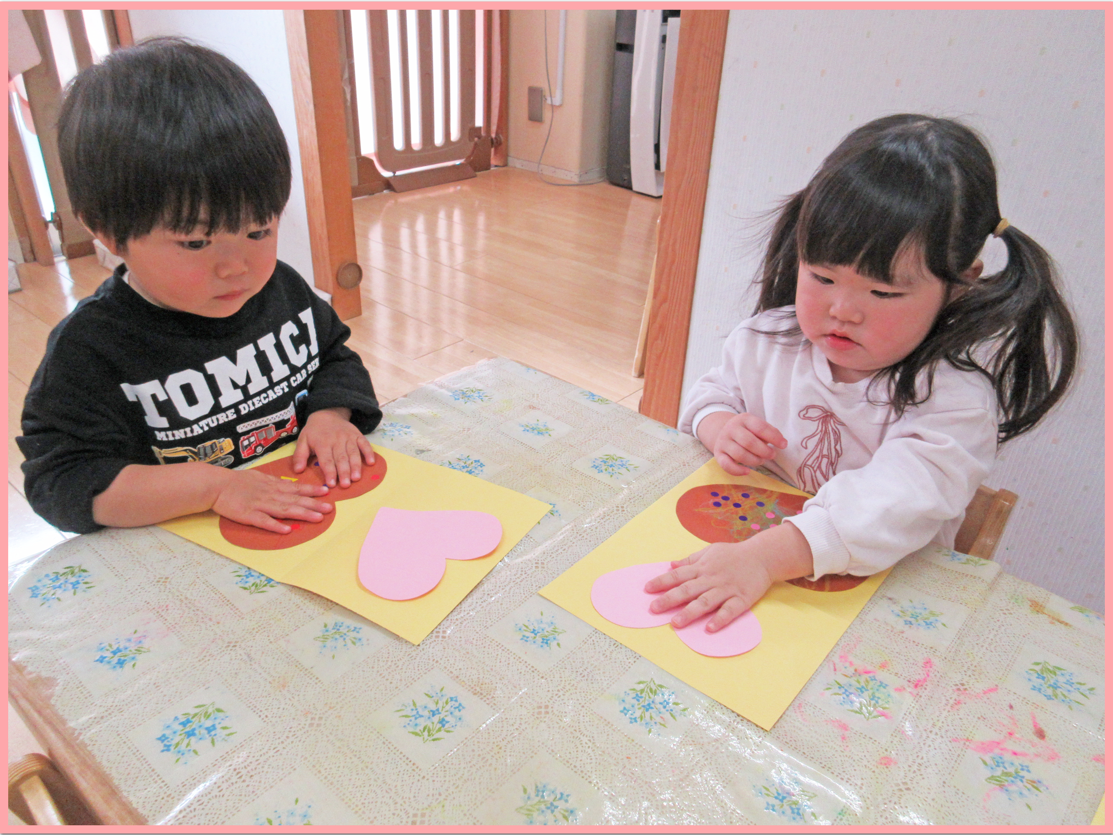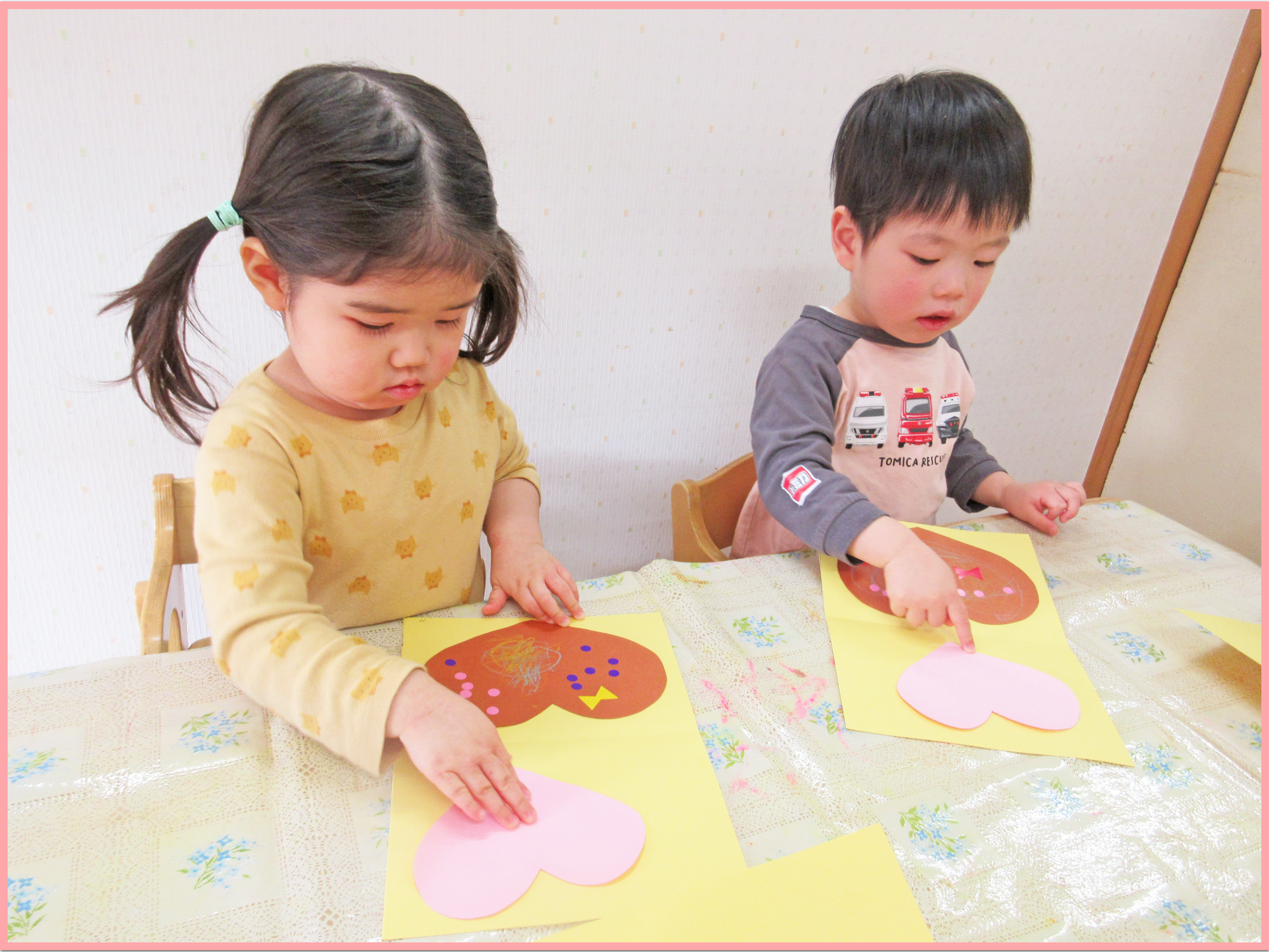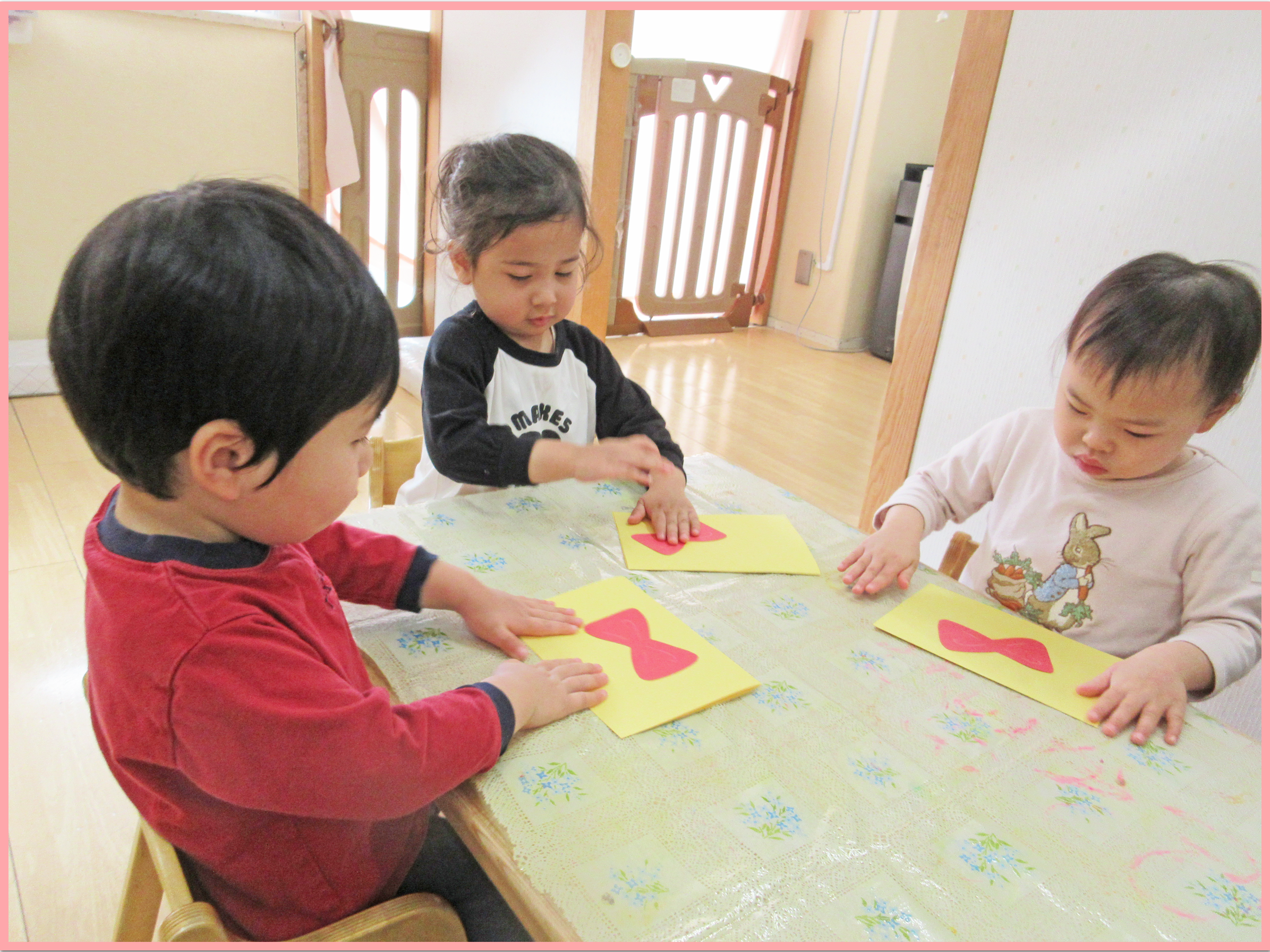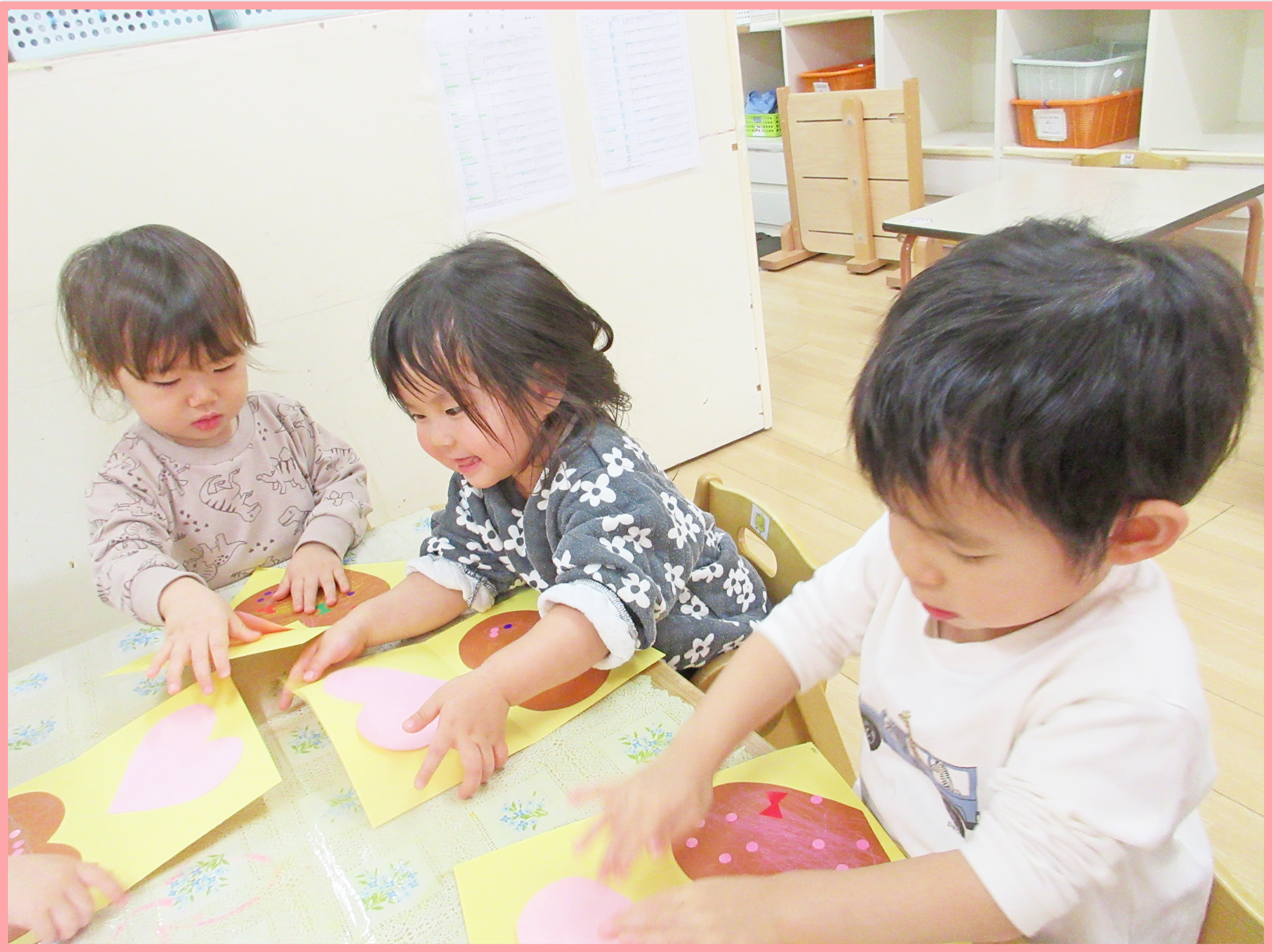 室内でバレンタインの製作を行いました。プレゼントに見立てた台紙にハートやリボンのパーツを貼ってラッピングをすると、「可愛いね」「一緒のハートだね」と嬉しそうに顔を見合わせながら話すこどもたち。保育者が「誰にあげるかな」と質問すると「ママパパ」や「〇〇ちゃんかな」とお友だちの名前を話す姿もあり、微笑ましかったです。
