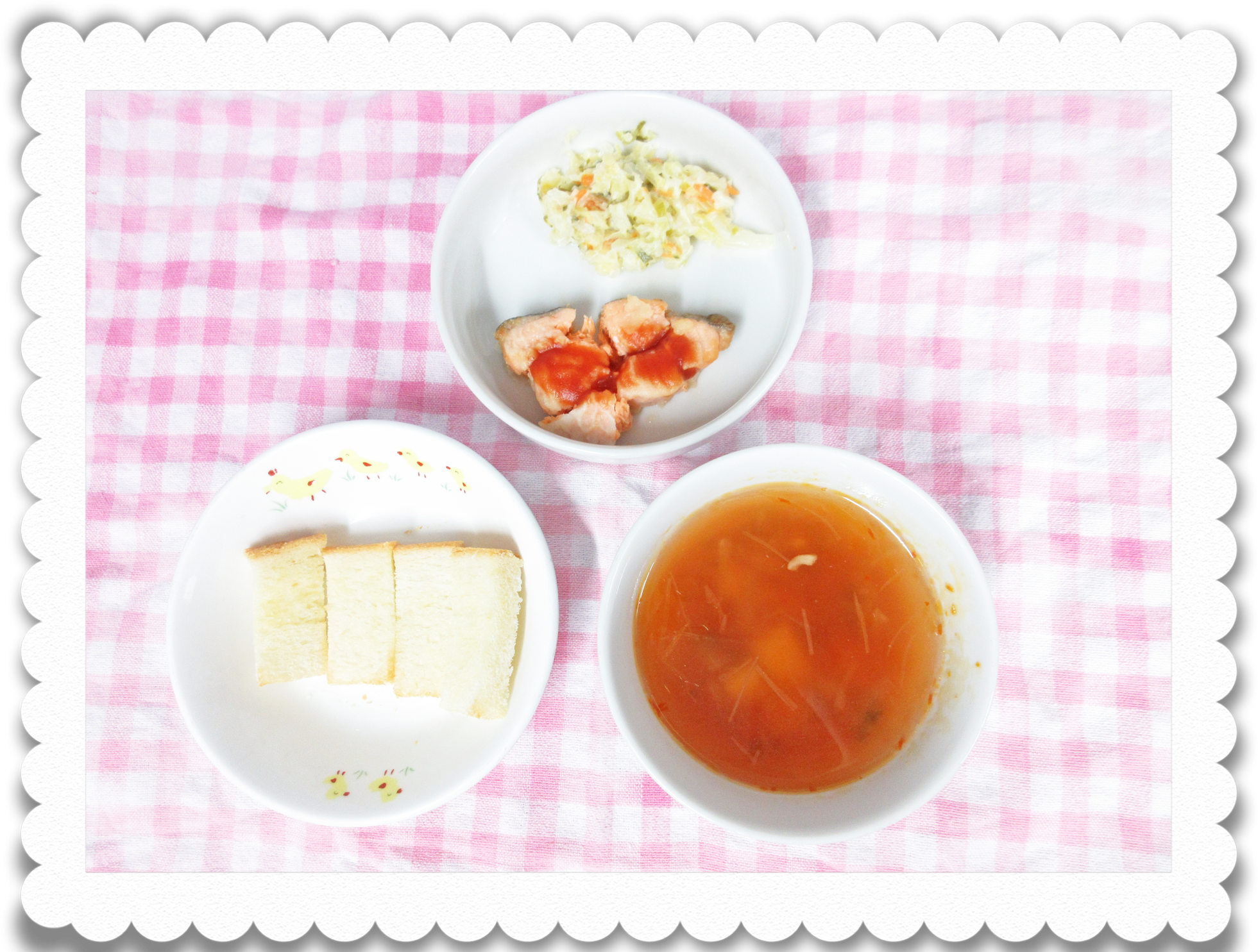 【幼児給食】バターロール、生鮭のムニエル、マヨネーズサラダ、ミネストローネスープ