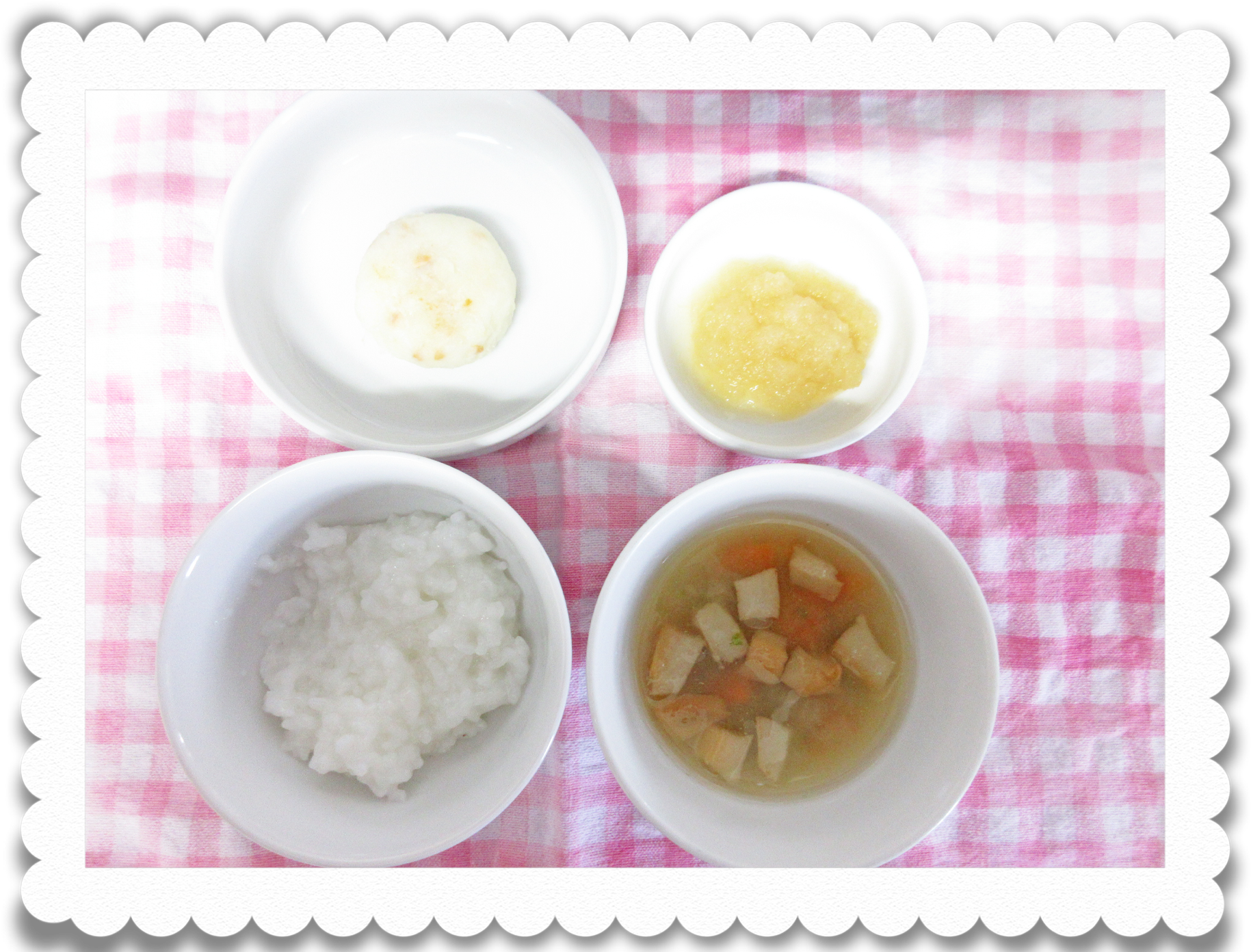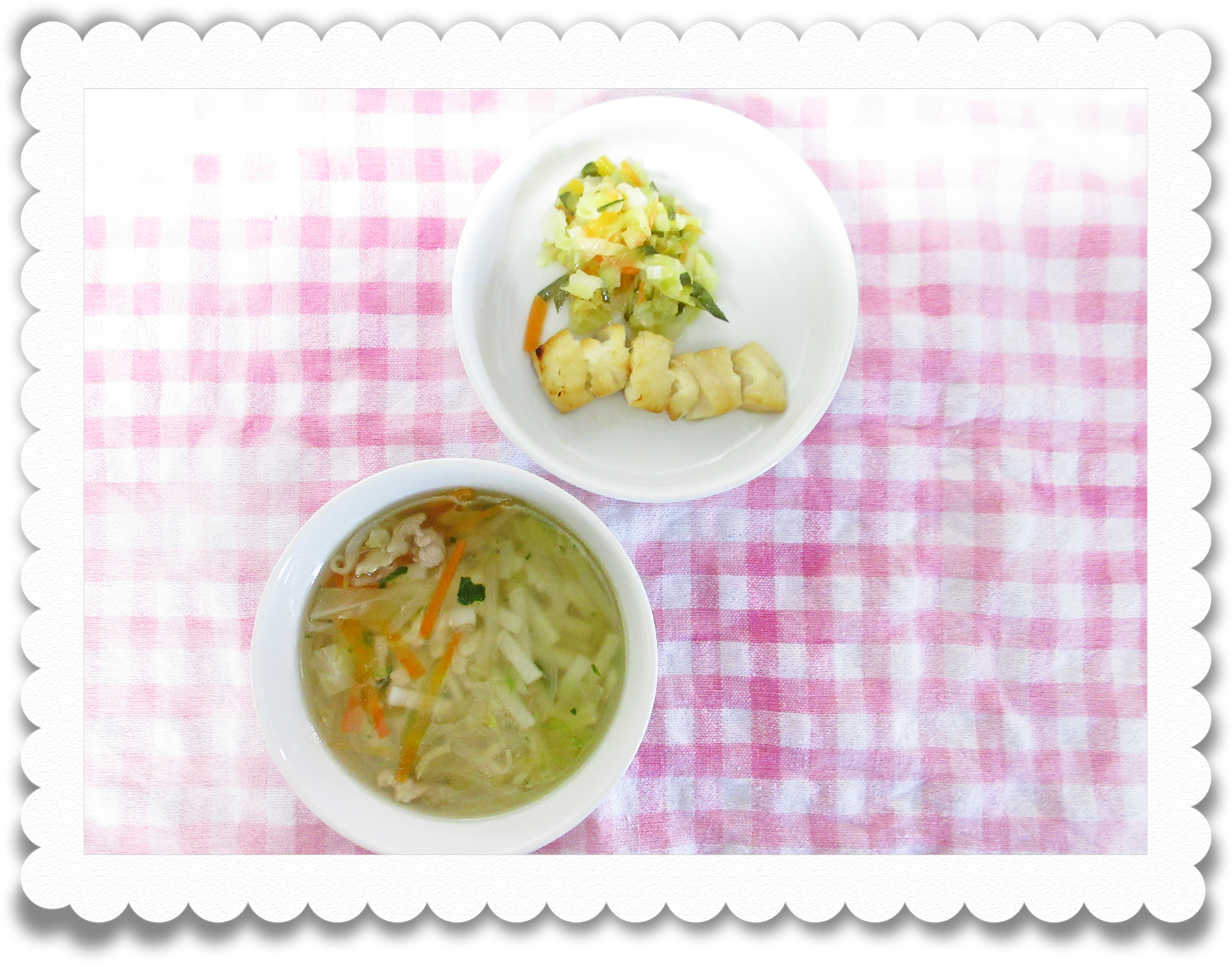午前食:野菜うどん、白身魚のりんご煮、フレンチあえ