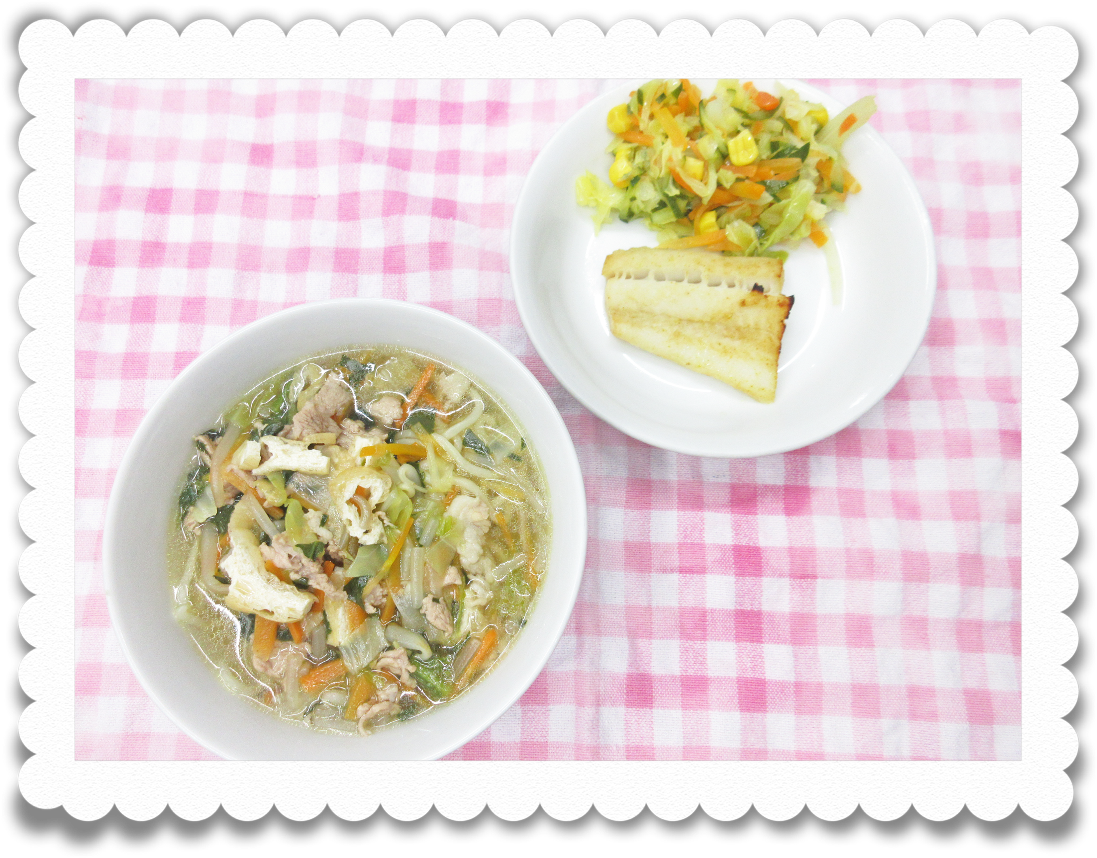 【幼児給食】タンメン、白身魚のカレー焼き(幼児)、白身魚の照焼き(乳児)、コーンサラダ