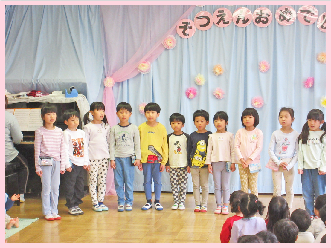 今日はホールで全クラス合同で、こすもす組のお別れ会を行い、こすもす組の卒園をお祝いしました。乳児クラスの子は『きらきらぼし』や『ちょうちょ』、『チューリップ』を振り付け付きで歌って、とても可愛らしかったです。幼児クラスは大きな声で歌い合奏をしたりと、上手に発表をすることができました。
