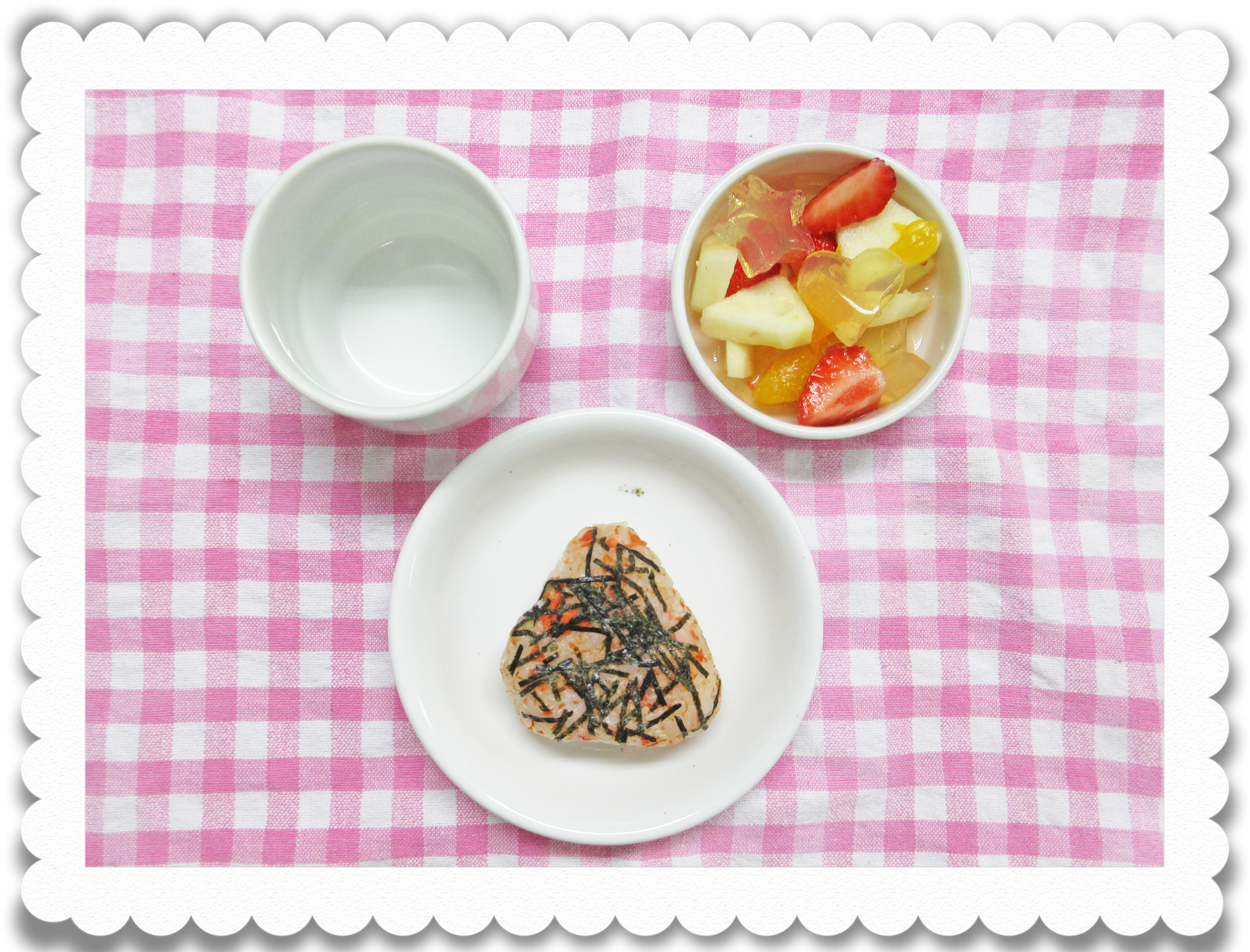 午後食:牛乳、鮭おにぎり、フルーツポンチ