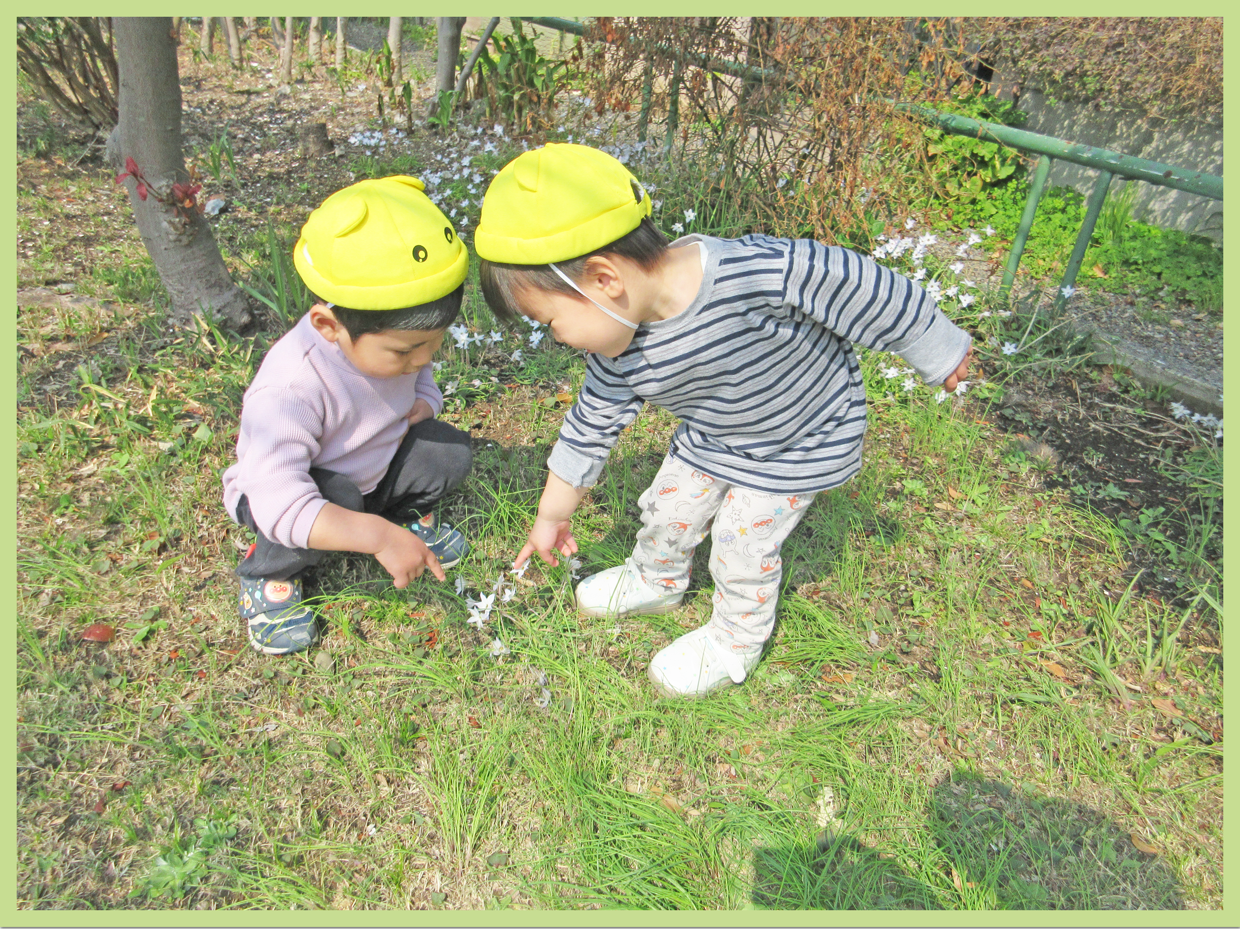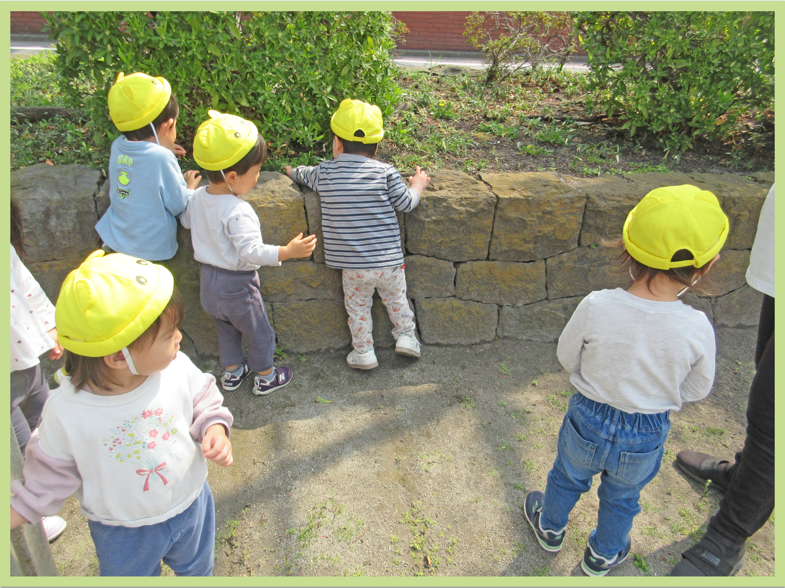 東一公園で散策を楽しみました。いつもはどんぐり探しに夢中なこどもたちですが、今日は保育者の「アリさんいるかな」の一言で一斉に虫探しをしていました。「あり、いた」「せんせ、みてみて」と嬉しそうに教えてくれるこどもたち。