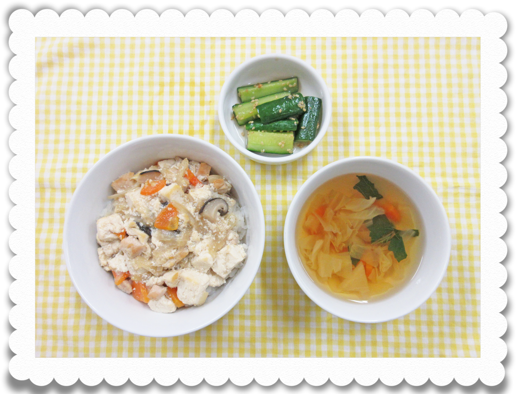 【幼児給食】炒り豆腐丼、中華風きゅうり、野菜スープ
