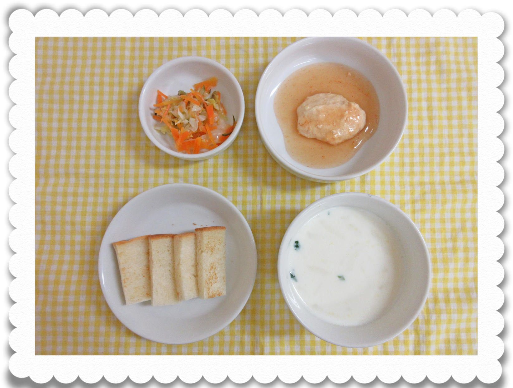 午前食:スープパン粥、ささみ挽の豆腐煮、きゅうり煮、ミルクスープ