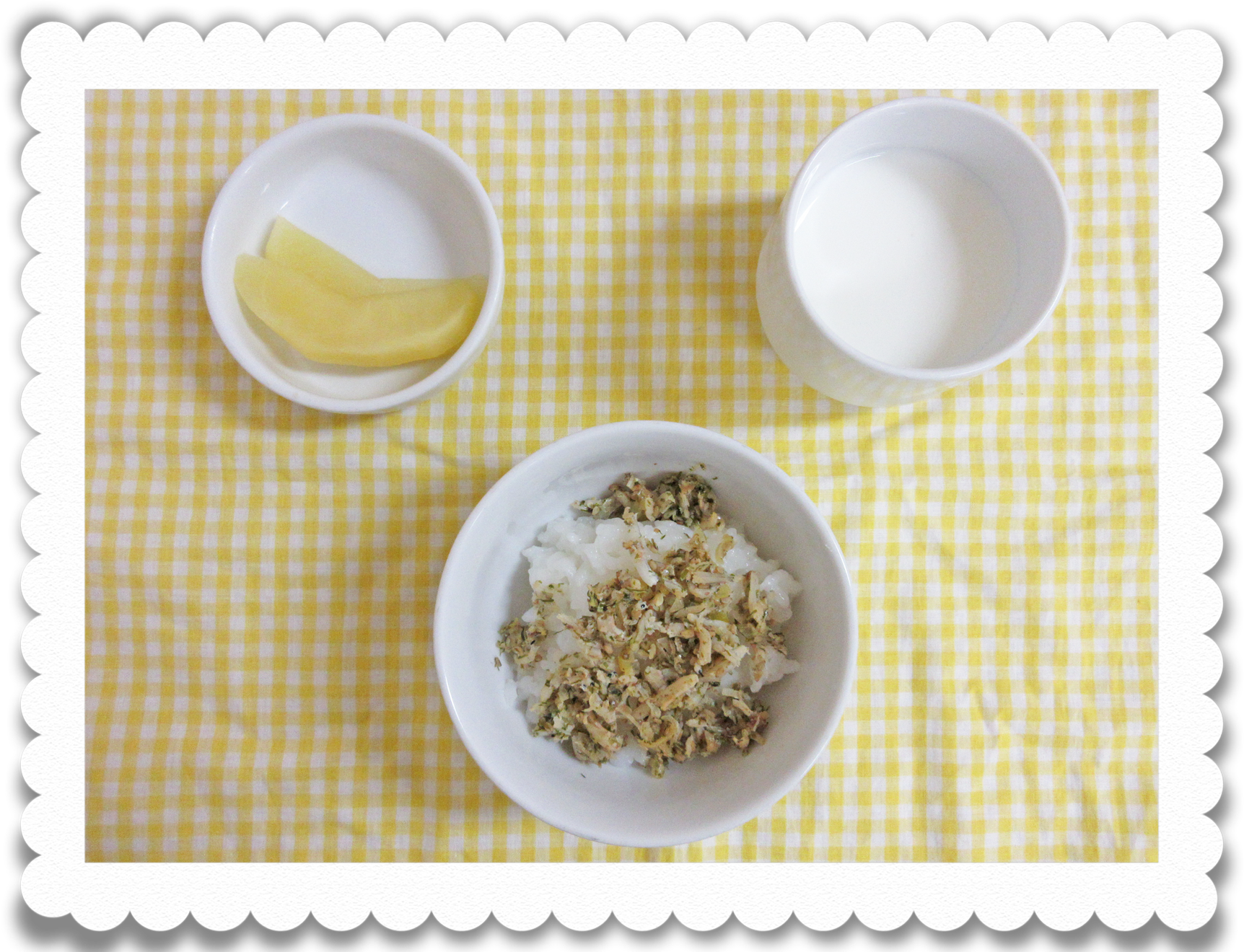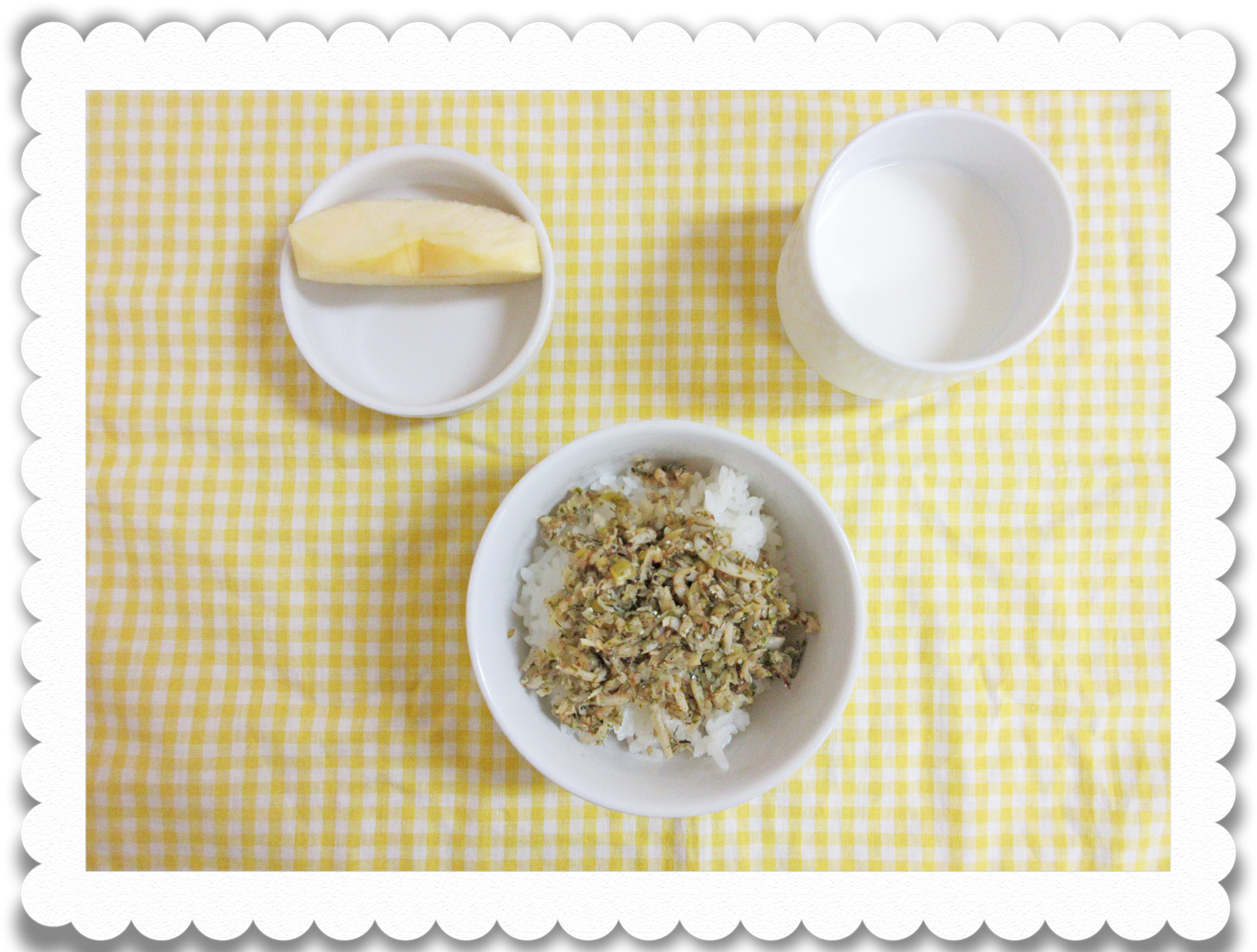 【幼児おやつ】牛乳、手作りふりかけご飯、果物